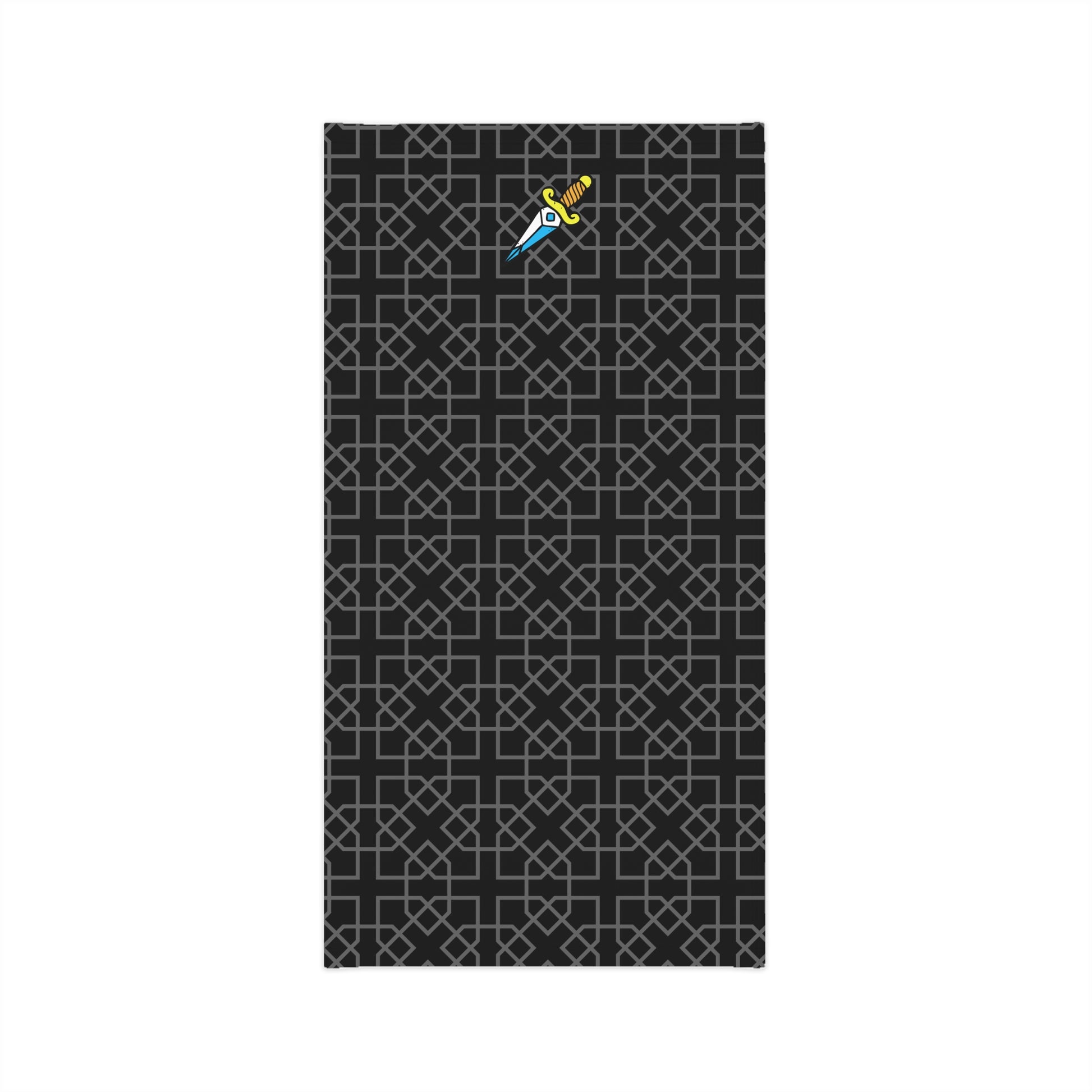 No wasted moves. The dagger stands clean and centered — sharp, direct, and final. Behind it, the interlocked geometric pattern builds a controlled structure, like everything is exactly where it needs to be. Black and grey strip it down to essentials.
